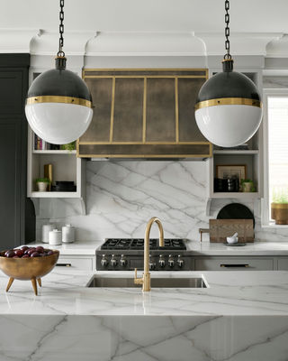 Fine English-style cabinetry and a coy pop of deep aubergine on the island give this kitchen regal pedigree.